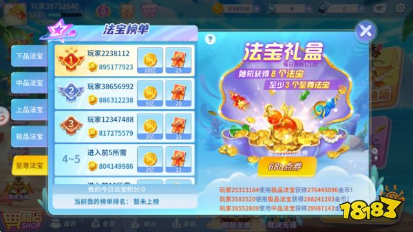 5、購買法寶離合,在漁場使用法寶擊殺魚類能獲得金幣,根據獲得的金幣數量參與法寶金榜排行也能獲得大量的金幣。