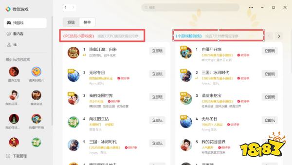 找游戲:分為“發現”信息流和包含8個榜單的“榜單頁”,其中新增“PC熱玩小游戲榜”。